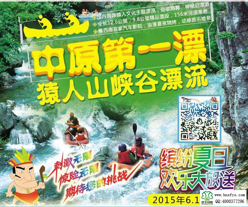 雙豐彩?。涸橙松綅{谷漂流 宣傳彩頁 成品尺寸:寬21cm 高28.5cm 內(nèi)容提要:中原第一漂,猿人山峽谷漂流,國內(nèi)首席猿人文化主題漂流,勁歌熱舞,神秘啟漂酒。全長12.6公里,9.8公里精品漂段,156米河道落差。豫西南首家汽車影院,浪漫夏夜燒烤,動(dòng)感音樂噴泉